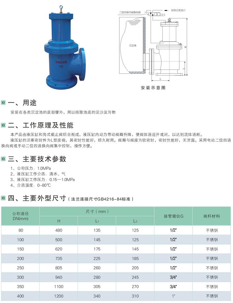 液壓、氣動(dòng)角式快開排泥閥,是一種由液壓源或氣動(dòng)源作執(zhí)行機(jī)構(gòu)的角型截止類閥門。通常成排安裝在沉淀池底部外側(cè)壁,用以排除池底沉淀的泥砂和污物。該閥液壓缸之活塞為L形皮碗,密封性能好,經(jīng)久耐用,閥門密封副亦為橡膠密封,無泄漏。還可通過電動(dòng)二位四通換向電磁閥實(shí)現(xiàn)遠(yuǎn)程控制。操作方便,安全可靠。液壓角式快開排泥閥,氣動(dòng)角式快開排泥閥,角式快開排泥閥。